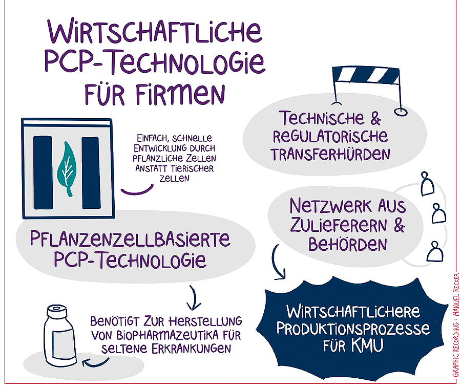 Die pflanzenzellbasierte PCP-Technologie ermöglicht im Gegensatz zu Säugerzellen die schnelle und flexible Herstellung komplexer Biopharmazeutika, scheitert jedoch bislang an den verfahrenstechnischen und regulatorischen Transferhürden. Mithilfe eines Ko-Kreation-Ansatzes soll als offener Experimentierraum ein PCP-Demonstrator entwickelt werden, in dem Firmen die GMP-konforme Produktion ihrer Kandidaten erproben und die PCP-Technologie für die individuelle Anwendung qualifizieren können.